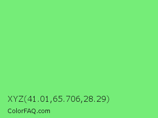 XYZ 41.01,65.706,28.29 Color is a light green color and the nearest color is Pastel Green #77dd77. Hex code #75ed78 and RGB value is rgb(117,237,120). In RGB color space, this color is composed of 46% red, 93% green, 47% blue, In CMYK color space, this color is composed of 51% cyan, 0% magenta, 49% yellow , 7% black , In HSL color space, this color has a hue angle of 122° , 77% saturation and 69% lightness.