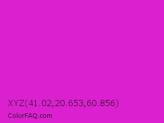 XYZ 41.02,20.653,60.856 Color is a normal magenta color and the nearest color is Steel Pink #cc33cc. Hex code #db21cf and RGB value is rgb(219,33,207). In RGB color space, this color is composed of 86% red, 13% green, 81% blue, In CMYK color space, this color is composed of 0% cyan, 85% magenta, 5% yellow , 14% black , In HSL color space, this color has a hue angle of 304° , 74% saturation and 49% lightness.