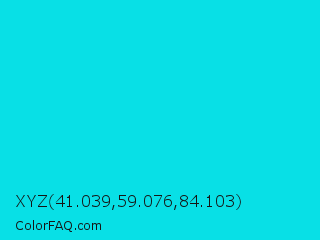 XYZ 41.039,59.076,84.103 Color is a normal cyan color and the nearest color is Bright Turquoise #08e8de. Hex code #08e0e6 and RGB value is rgb(8,224,230). In RGB color space, this color is composed of 3% red, 88% green, 90% blue, In CMYK color space, this color is composed of 97% cyan, 3% magenta, 0% yellow , 10% black , In HSL color space, this color has a hue angle of 182° , 93% saturation and 47% lightness.
