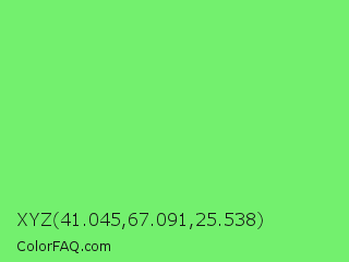 XYZ 41.045,67.091,25.538 Color is a light green color and the nearest color is Screamin Green #66ff66. Hex code #73f06e and RGB value is rgb(115,240,110). In RGB color space, this color is composed of 45% red, 94% green, 43% blue, In CMYK color space, this color is composed of 52% cyan, 0% magenta, 54% yellow , 6% black , In HSL color space, this color has a hue angle of 118° , 81% saturation and 69% lightness.
