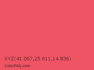 XYZ 41.067,25.611,14.836 Color is a light red color and the nearest color is Carnation #f95a61. Hex code #ef5464 and RGB value is rgb(239,84,100). In RGB color space, this color is composed of 94% red, 33% green, 39% blue, In CMYK color space, this color is composed of 0% cyan, 65% magenta, 58% yellow , 6% black , In HSL color space, this color has a hue angle of 354° , 83% saturation and 63% lightness.
