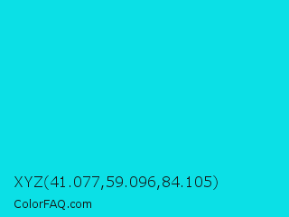 XYZ 41.077,59.096,84.105 Color is a normal cyan color and the nearest color is Bright Turquoise #08e8de. Hex code #0be0e6 and RGB value is rgb(11,224,230). In RGB color space, this color is composed of 4% red, 88% green, 90% blue, In CMYK color space, this color is composed of 95% cyan, 3% magenta, 0% yellow , 10% black , In HSL color space, this color has a hue angle of 182° , 91% saturation and 47% lightness.