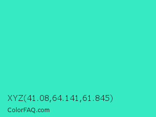 XYZ 41.08,64.141,61.845 Color is a normal cyan color and the nearest color is Turquoise #40e0d0. Hex code #36ebc3 and RGB value is rgb(54,235,195). In RGB color space, this color is composed of 21% red, 92% green, 76% blue, In CMYK color space, this color is composed of 77% cyan, 0% magenta, 17% yellow , 8% black , In HSL color space, this color has a hue angle of 167° , 82% saturation and 57% lightness.