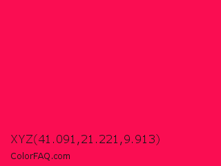 XYZ 41.091,21.221,9.913 Color is a normal rose color and the nearest color is Folly #ff004f. Hex code #fa0d52 and RGB value is rgb(250,13,82). In RGB color space, this color is composed of 98% red, 5% green, 32% blue, In CMYK color space, this color is composed of 0% cyan, 95% magenta, 67% yellow , 2% black , In HSL color space, this color has a hue angle of 343° , 96% saturation and 52% lightness.