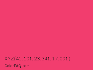 XYZ 41.101,23.341,17.091 Color is a normal rose color and the nearest color is Neon Fuchsia #fe4164. Hex code #f23d6e and RGB value is rgb(242,61,110). In RGB color space, this color is composed of 95% red, 24% green, 43% blue, In CMYK color space, this color is composed of 0% cyan, 75% magenta, 55% yellow , 5% black , In HSL color space, this color has a hue angle of 344° , 87% saturation and 59% lightness.