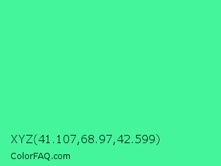 XYZ 41.107,68.97,42.599 Color is a light green color and the nearest color is Eucalyptus #44d7a8. Hex code #45f59c and RGB value is rgb(69,245,156). In RGB color space, this color is composed of 27% red, 96% green, 61% blue, In CMYK color space, this color is composed of 72% cyan, 0% magenta, 36% yellow , 4% black , In HSL color space, this color has a hue angle of 150° , 90% saturation and 62% lightness.
