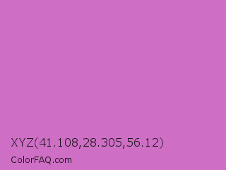 XYZ 41.108,28.305,56.12 Color is a light magenta color and the nearest color is French Mauve #d473d4. Hex code #ce6ec5 and RGB value is rgb(206,110,197). In RGB color space, this color is composed of 81% red, 43% green, 77% blue, In CMYK color space, this color is composed of 0% cyan, 47% magenta, 4% yellow , 19% black , In HSL color space, this color has a hue angle of 306° , 49% saturation and 62% lightness.