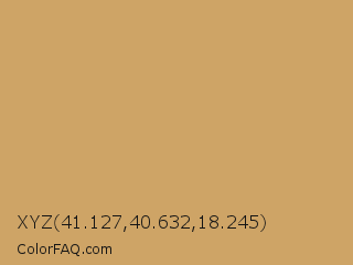 XYZ 41.127,40.632,18.245 Color is a normal orange color and the nearest color is Brown Yellow #cc9966. Hex code #cea466 and RGB value is rgb(206,164,102). In RGB color space, this color is composed of 81% red, 64% green, 40% blue, In CMYK color space, this color is composed of 0% cyan, 20% magenta, 50% yellow , 19% black , In HSL color space, this color has a hue angle of 36° , 51% saturation and 60% lightness.