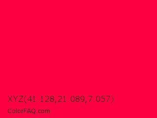 XYZ 41.128,21.089,7.057 Color is a normal rose color and the nearest color is Electric Crimson #ff003f. Hex code #fc0042 and RGB value is rgb(252,0,66). In RGB color space, this color is composed of 99% red, 0% green, 26% blue, In CMYK color space, this color is composed of 0% cyan, 100% magenta, 74% yellow , 1% black , In HSL color space, this color has a hue angle of 344° , 100% saturation and 49% lightness.