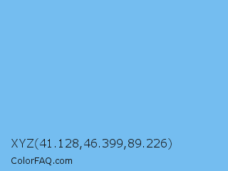 XYZ 41.128,46.399,89.226 Color is a light blue color and the nearest color is Very Light Azure #74bbfb. Hex code #74bdf0 and RGB value is rgb(116,189,240). In RGB color space, this color is composed of 45% red, 74% green, 94% blue, In CMYK color space, this color is composed of 52% cyan, 21% magenta, 0% yellow , 6% black , In HSL color space, this color has a hue angle of 205° , 81% saturation and 70% lightness.