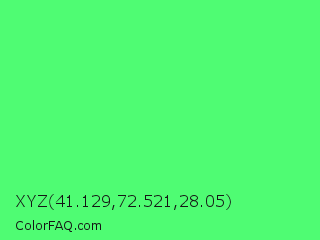 XYZ 41.129,72.521,28.05 Color is a light green color and the nearest color is Screamin Green #66ff66. Hex code #4ffc73 and RGB value is rgb(79,252,115). In RGB color space, this color is composed of 31% red, 99% green, 45% blue, In CMYK color space, this color is composed of 69% cyan, 0% magenta, 54% yellow , 1% black , In HSL color space, this color has a hue angle of 132° , 97% saturation and 65% lightness.