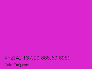 XYZ 41.137,20.888,60.895 Color is a normal magenta color and the nearest color is Steel Pink #cc33cc. Hex code #db25cf and RGB value is rgb(219,37,207). In RGB color space, this color is composed of 86% red, 15% green, 81% blue, In CMYK color space, this color is composed of 0% cyan, 83% magenta, 5% yellow , 14% black , In HSL color space, this color has a hue angle of 304° , 72% saturation and 50% lightness.