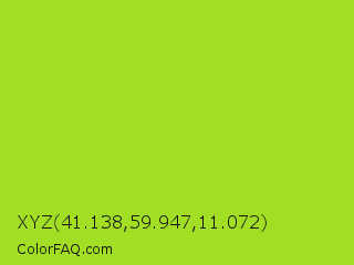 XYZ 41.138,59.947,11.072 Color is a normal green color and the nearest color is Atlantis #97cd2d. Hex code #a1de24 and RGB value is rgb(161,222,36). In RGB color space, this color is composed of 63% red, 87% green, 14% blue, In CMYK color space, this color is composed of 27% cyan, 0% magenta, 84% yellow , 13% black , In HSL color space, this color has a hue angle of 80° , 74% saturation and 51% lightness.