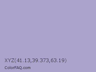 XYZ 41.13,39.373,63.19 Color is a light indigo color and the nearest color is Logan #aaa9cd. Hex code #aca3cd and RGB value is rgb(172,163,205). In RGB color space, this color is composed of 67% red, 64% green, 80% blue, In CMYK color space, this color is composed of 16% cyan, 20% magenta, 0% yellow , 20% black , In HSL color space, this color has a hue angle of 253° , 30% saturation and 72% lightness.