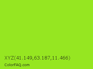 XYZ 41.149,63.187,11.466 Color is a normal green color and the nearest color is Atlantis #97cd2d. Hex code #96e621 and RGB value is rgb(150,230,33). In RGB color space, this color is composed of 59% red, 90% green, 13% blue, In CMYK color space, this color is composed of 35% cyan, 0% magenta, 86% yellow , 10% black , In HSL color space, this color has a hue angle of 84° , 80% saturation and 52% lightness.