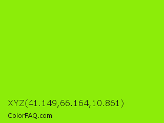 XYZ 41.149,66.164,10.861 Color is a normal green color and the nearest color is Alien Armpit #84de02. Hex code #8ced09 and RGB value is rgb(140,237,9). In RGB color space, this color is composed of 55% red, 93% green, 4% blue, In CMYK color space, this color is composed of 41% cyan, 0% magenta, 96% yellow , 7% black , In HSL color space, this color has a hue angle of 86° , 93% saturation and 48% lightness.