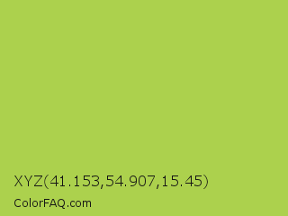 XYZ 41.153,54.907,15.45 Color is a normal lime color and the nearest color is Conifer #acdd4d. Hex code #acd14d and RGB value is rgb(172,209,77). In RGB color space, this color is composed of 67% red, 82% green, 30% blue, In CMYK color space, this color is composed of 18% cyan, 0% magenta, 63% yellow , 18% black , In HSL color space, this color has a hue angle of 77° , 59% saturation and 56% lightness.