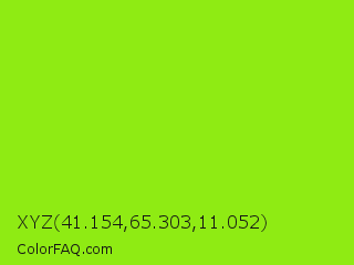 XYZ 41.154,65.303,11.052 Color is a normal green color and the nearest color is Alien Armpit #84de02. Hex code #8feb13 and RGB value is rgb(143,235,19). In RGB color space, this color is composed of 56% red, 92% green, 7% blue, In CMYK color space, this color is composed of 39% cyan, 0% magenta, 92% yellow , 8% black , In HSL color space, this color has a hue angle of 86° , 85% saturation and 50% lightness.