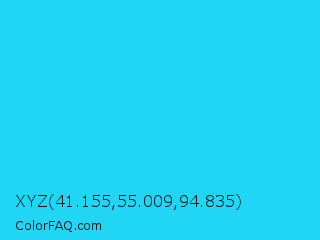 XYZ 41.155,55.009,94.835 Color is a normal cyan color and the nearest color is Spiro Disco Ball #0fc0fc. Hex code #21d6f5 and RGB value is rgb(33,214,245). In RGB color space, this color is composed of 13% red, 84% green, 96% blue, In CMYK color space, this color is composed of 87% cyan, 13% magenta, 0% yellow , 4% black , In HSL color space, this color has a hue angle of 189° , 91% saturation and 55% lightness.
