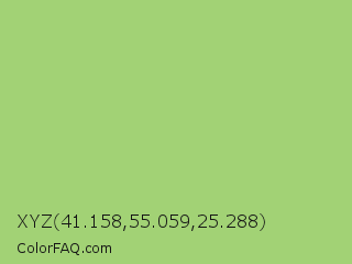XYZ 41.158,55.059,25.288 Color is a light green color and the nearest color is Pistachio #93c572. Hex code #a2d275 and RGB value is rgb(162,210,117). In RGB color space, this color is composed of 64% red, 82% green, 46% blue, In CMYK color space, this color is composed of 23% cyan, 0% magenta, 44% yellow , 18% black , In HSL color space, this color has a hue angle of 91° , 51% saturation and 64% lightness.
