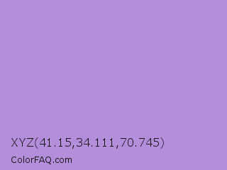 XYZ 41.15,34.111,70.745 Color is a light violet color and the nearest color is Light Pastel Purple #b19cd9. Hex code #b48eda and RGB value is rgb(180,142,218). In RGB color space, this color is composed of 71% red, 56% green, 85% blue, In CMYK color space, this color is composed of 17% cyan, 35% magenta, 0% yellow , 15% black , In HSL color space, this color has a hue angle of 270° , 51% saturation and 71% lightness.