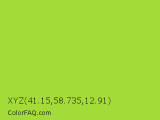 XYZ 41.15,58.735,12.91 Color is a normal green color and the nearest color is Yellow Green #9acd32. Hex code #a3db38 and RGB value is rgb(163,219,56). In RGB color space, this color is composed of 64% red, 86% green, 22% blue, In CMYK color space, this color is composed of 26% cyan, 0% magenta, 74% yellow , 14% black , In HSL color space, this color has a hue angle of 81° , 69% saturation and 54% lightness.