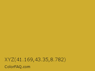 XYZ 41.169,43.35,8.782 Color is a normal yellow color and the nearest color is Gold Metallic #d4af37. Hex code #cfad2e and RGB value is rgb(207,173,46). In RGB color space, this color is composed of 81% red, 68% green, 18% blue, In CMYK color space, this color is composed of 0% cyan, 16% magenta, 78% yellow , 19% black , In HSL color space, this color has a hue angle of 47° , 64% saturation and 50% lightness.