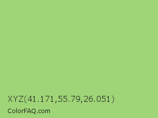 XYZ 41.171,55.79,26.051 Color is a light green color and the nearest color is Pistachio #93c572. Hex code #9fd477 and RGB value is rgb(159,212,119). In RGB color space, this color is composed of 62% red, 83% green, 47% blue, In CMYK color space, this color is composed of 25% cyan, 0% magenta, 44% yellow , 17% black , In HSL color space, this color has a hue angle of 94° , 52% saturation and 65% lightness.
