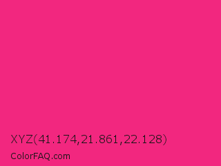 XYZ 41.174,21.861,22.128 Color is a normal rose color and the nearest color is Cerise Pink #ec3b83. Hex code #f2277f and RGB value is rgb(242,39,127). In RGB color space, this color is composed of 95% red, 15% green, 50% blue, In CMYK color space, this color is composed of 0% cyan, 84% magenta, 48% yellow , 5% black , In HSL color space, this color has a hue angle of 334° , 89% saturation and 55% lightness.