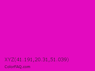 XYZ 41.191,20.31,51.039 Color is a normal magenta color and the nearest color is Shocking Pink #fc0fc0. Hex code #e30abf and RGB value is rgb(227,10,191). In RGB color space, this color is composed of 89% red, 4% green, 75% blue, In CMYK color space, this color is composed of 0% cyan, 96% magenta, 16% yellow , 11% black , In HSL color space, this color has a hue angle of 310° , 92% saturation and 46% lightness.