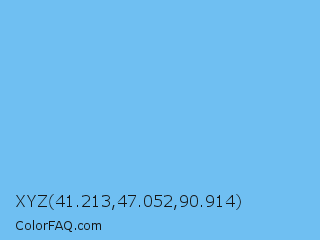 XYZ 41.213,47.052,90.914 Color is a light blue color and the nearest color is Maya Blue #73c2fb. Hex code #6fbff2 and RGB value is rgb(111,191,242). In RGB color space, this color is composed of 44% red, 75% green, 95% blue, In CMYK color space, this color is composed of 54% cyan, 21% magenta, 0% yellow , 5% black , In HSL color space, this color has a hue angle of 203° , 83% saturation and 69% lightness.