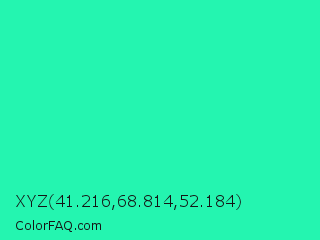 XYZ 41.216,68.814,52.184 Color is a normal green color and the nearest color is Turquoise PWG #30d5c8. Hex code #24f5b0 and RGB value is rgb(36,245,176). In RGB color space, this color is composed of 14% red, 96% green, 69% blue, In CMYK color space, this color is composed of 85% cyan, 0% magenta, 28% yellow , 4% black , In HSL color space, this color has a hue angle of 160° , 91% saturation and 55% lightness.