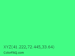 XYZ 41.222,72.445,33.64 Color is a light green color and the nearest color is Very Light Malachite Green #64e986. Hex code #42fc84 and RGB value is rgb(66,252,132). In RGB color space, this color is composed of 26% red, 99% green, 52% blue, In CMYK color space, this color is composed of 74% cyan, 0% magenta, 48% yellow , 1% black , In HSL color space, this color has a hue angle of 141° , 97% saturation and 62% lightness.