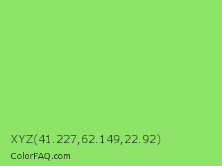 XYZ 41.227,62.149,22.92 Color is a light green color and the nearest color is Pastel Green #77dd77. Hex code #8de468 and RGB value is rgb(141,228,104). In RGB color space, this color is composed of 55% red, 89% green, 41% blue, In CMYK color space, this color is composed of 38% cyan, 0% magenta, 54% yellow , 11% black , In HSL color space, this color has a hue angle of 102° , 70% saturation and 65% lightness.