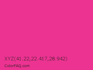 XYZ 41.22,22.417,28.942 Color is a normal rose color and the nearest color is Cerise Pink #ec3b83. Hex code #ed3391 and RGB value is rgb(237,51,145). In RGB color space, this color is composed of 93% red, 20% green, 57% blue, In CMYK color space, this color is composed of 0% cyan, 78% magenta, 39% yellow , 7% black , In HSL color space, this color has a hue angle of 330° , 84% saturation and 56% lightness.