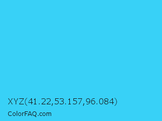 XYZ 41.22,53.157,96.084 Color is a normal cyan color and the nearest color is Picton Blue #45b1e8. Hex code #38d1f7 and RGB value is rgb(56,209,247). In RGB color space, this color is composed of 22% red, 82% green, 97% blue, In CMYK color space, this color is composed of 77% cyan, 15% magenta, 0% yellow , 3% black , In HSL color space, this color has a hue angle of 192° , 92% saturation and 59% lightness.