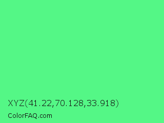 XYZ 41.22,70.128,33.918 Color is a light green color and the nearest color is Very Light Malachite Green #64e986. Hex code #54f786 and RGB value is rgb(84,247,134). In RGB color space, this color is composed of 33% red, 97% green, 53% blue, In CMYK color space, this color is composed of 66% cyan, 0% magenta, 46% yellow , 3% black , In HSL color space, this color has a hue angle of 138° , 91% saturation and 65% lightness.