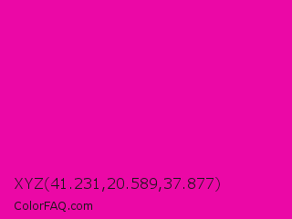 XYZ 41.231,20.589,37.877 Color is a normal magenta color and the nearest color is Hollywood Cerise #f400a1. Hex code #eb08a6 and RGB value is rgb(235,8,166). In RGB color space, this color is composed of 92% red, 3% green, 65% blue, In CMYK color space, this color is composed of 0% cyan, 97% magenta, 29% yellow , 8% black , In HSL color space, this color has a hue angle of 318° , 93% saturation and 48% lightness.