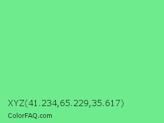 XYZ 41.234,65.229,35.617 Color is a light green color and the nearest color is Very Light Malachite Green #64e986. Hex code #6eec8d and RGB value is rgb(110,236,141). In RGB color space, this color is composed of 43% red, 93% green, 55% blue, In CMYK color space, this color is composed of 53% cyan, 0% magenta, 40% yellow , 7% black , In HSL color space, this color has a hue angle of 135° , 77% saturation and 68% lightness.