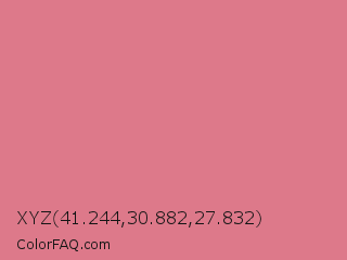 XYZ 41.244,30.882,27.832 Color is a light red color and the nearest color is Pale Red Violet #db7093. Hex code #dd798a and RGB value is rgb(221,121,138). In RGB color space, this color is composed of 87% red, 47% green, 54% blue, In CMYK color space, this color is composed of 0% cyan, 45% magenta, 38% yellow , 13% black , In HSL color space, this color has a hue angle of 350° , 60% saturation and 67% lightness.