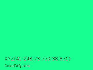 XYZ 41.248,73.759,38.851 Color is a normal green color and the nearest color is Medium Spring Green #00fa9a. Hex code #18ff91 and RGB value is rgb(24,255,145). In RGB color space, this color is composed of 9% red, 100% green, 57% blue, In CMYK color space, this color is composed of 91% cyan, 0% magenta, 43% yellow , 0% black , In HSL color space, this color has a hue angle of 151° , 100% saturation and 55% lightness.