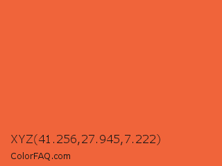 XYZ 41.256,27.945,7.222 Color is a normal red color and the nearest color is Orange Soda #fa5b3d. Hex code #f0643a and RGB value is rgb(240,100,58). In RGB color space, this color is composed of 94% red, 39% green, 23% blue, In CMYK color space, this color is composed of 0% cyan, 58% magenta, 76% yellow , 6% black , In HSL color space, this color has a hue angle of 14° , 86% saturation and 58% lightness.