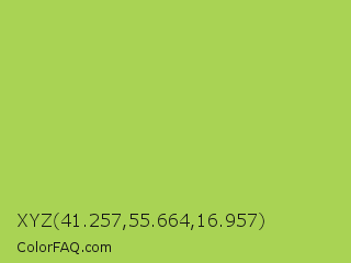 XYZ 41.257,55.664,16.957 Color is a normal green color and the nearest color is Conifer #acdd4d. Hex code #a9d354 and RGB value is rgb(169,211,84). In RGB color space, this color is composed of 66% red, 83% green, 33% blue, In CMYK color space, this color is composed of 20% cyan, 0% magenta, 60% yellow , 17% black , In HSL color space, this color has a hue angle of 80° , 59% saturation and 58% lightness.