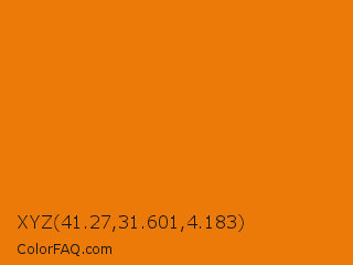 XYZ 41.27,31.601,4.183 Color is a normal orange color and the nearest color is Tahiti Gold #e97c07. Hex code #eb7a09 and RGB value is rgb(235,122,9). In RGB color space, this color is composed of 92% red, 48% green, 4% blue, In CMYK color space, this color is composed of 0% cyan, 48% magenta, 96% yellow , 8% black , In HSL color space, this color has a hue angle of 30° , 93% saturation and 48% lightness.