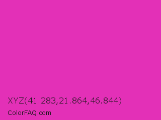 XYZ 41.283,21.864,46.844 Color is a normal magenta color and the nearest color is Frostbite #e936a7. Hex code #e330b7 and RGB value is rgb(227,48,183). In RGB color space, this color is composed of 89% red, 19% green, 72% blue, In CMYK color space, this color is composed of 0% cyan, 79% magenta, 19% yellow , 11% black , In HSL color space, this color has a hue angle of 315° , 76% saturation and 54% lightness.