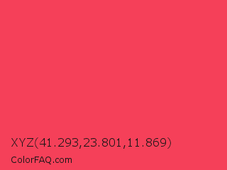 XYZ 41.293,23.801,11.869 Color is a light red color and the nearest color is Desire #ea3c53. Hex code #f54059 and RGB value is rgb(245,64,89). In RGB color space, this color is composed of 96% red, 25% green, 35% blue, In CMYK color space, this color is composed of 0% cyan, 74% magenta, 64% yellow , 4% black , In HSL color space, this color has a hue angle of 352° , 90% saturation and 61% lightness.