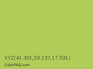 XYZ 41.301,53.137,17.531 Color is a normal lime color and the nearest color is Celery #b8c25d. Hex code #b0cc59 and RGB value is rgb(176,204,89). In RGB color space, this color is composed of 69% red, 80% green, 35% blue, In CMYK color space, this color is composed of 14% cyan, 0% magenta, 56% yellow , 20% black , In HSL color space, this color has a hue angle of 75° , 53% saturation and 57% lightness.