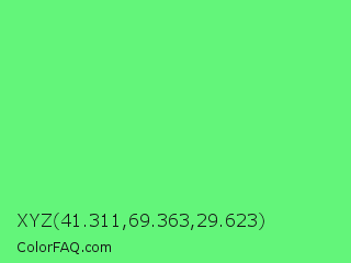 XYZ 41.311,69.363,29.623 Color is a light green color and the nearest color is Very Light Malachite Green #64e986. Hex code #63f57a and RGB value is rgb(99,245,122). In RGB color space, this color is composed of 39% red, 96% green, 48% blue, In CMYK color space, this color is composed of 60% cyan, 0% magenta, 50% yellow , 4% black , In HSL color space, this color has a hue angle of 129° , 88% saturation and 67% lightness.