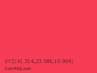 XYZ 41.314,23.586,10.969 Color is a normal red color and the nearest color is Sizzling Red #ff3855. Hex code #f63d55 and RGB value is rgb(246,61,85). In RGB color space, this color is composed of 96% red, 24% green, 33% blue, In CMYK color space, this color is composed of 0% cyan, 75% magenta, 65% yellow , 4% black , In HSL color space, this color has a hue angle of 352° , 91% saturation and 60% lightness.