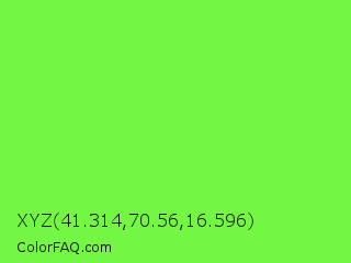XYZ 41.314,70.56,16.596 Color is a light green color and the nearest color is Spring Frost #87ff2a. Hex code #73f742 and RGB value is rgb(115,247,66). In RGB color space, this color is composed of 45% red, 97% green, 26% blue, In CMYK color space, this color is composed of 53% cyan, 0% magenta, 73% yellow , 3% black , In HSL color space, this color has a hue angle of 104° , 92% saturation and 61% lightness.